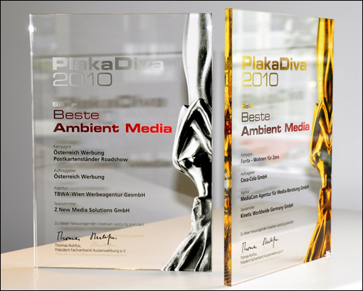 Plexiglas-Urkunden, Awards aus Acrylglas, Auszeichnungen aus Plexiglas sind schöne Designobjekte. Hier auf der jährlichen PlakaDiva als Urkunde für die Gewinner.