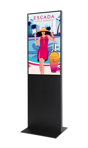 Digitaler Tower trend line mit 43" Monitor. Digitale Stele mit schlankem Design für moderne Werbepräsentationen.