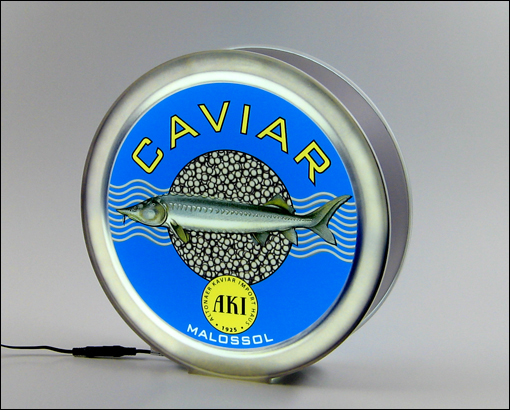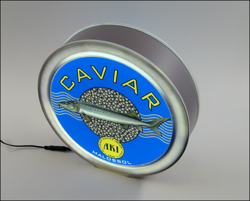 Hier haben wir eine Leuchte in Form einer Caviardose entworfen und umgesetzt.