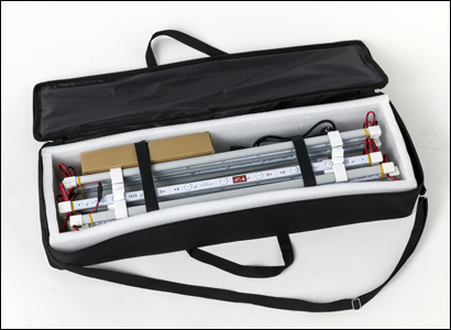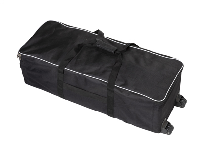 Mit dem gepolsterten Trolley mit Rädern können Sie Ihre tragbare Rückwand leicht transportieren. Ein Trolley mit einer zusätzlichen Tasche zur Aufbewahrung der Stangen des Pop-Up light.